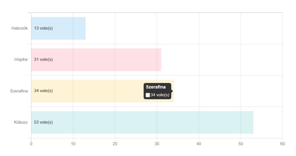 Pár napja elindítottunk egy szavazást, ahol ti dönthettetek arról, hogy mi legyen a legújabb lakóink neve. Rengeteg szavazat érkezett, amiért nagyon hálásak vagyunk, hogy ennyire figyelemmel kíséritek a cicáink mindennapjait. Egy név nagyon magabiztosan nyert. Egy név, ami édes, játékos és egy kicsit egzotikus.